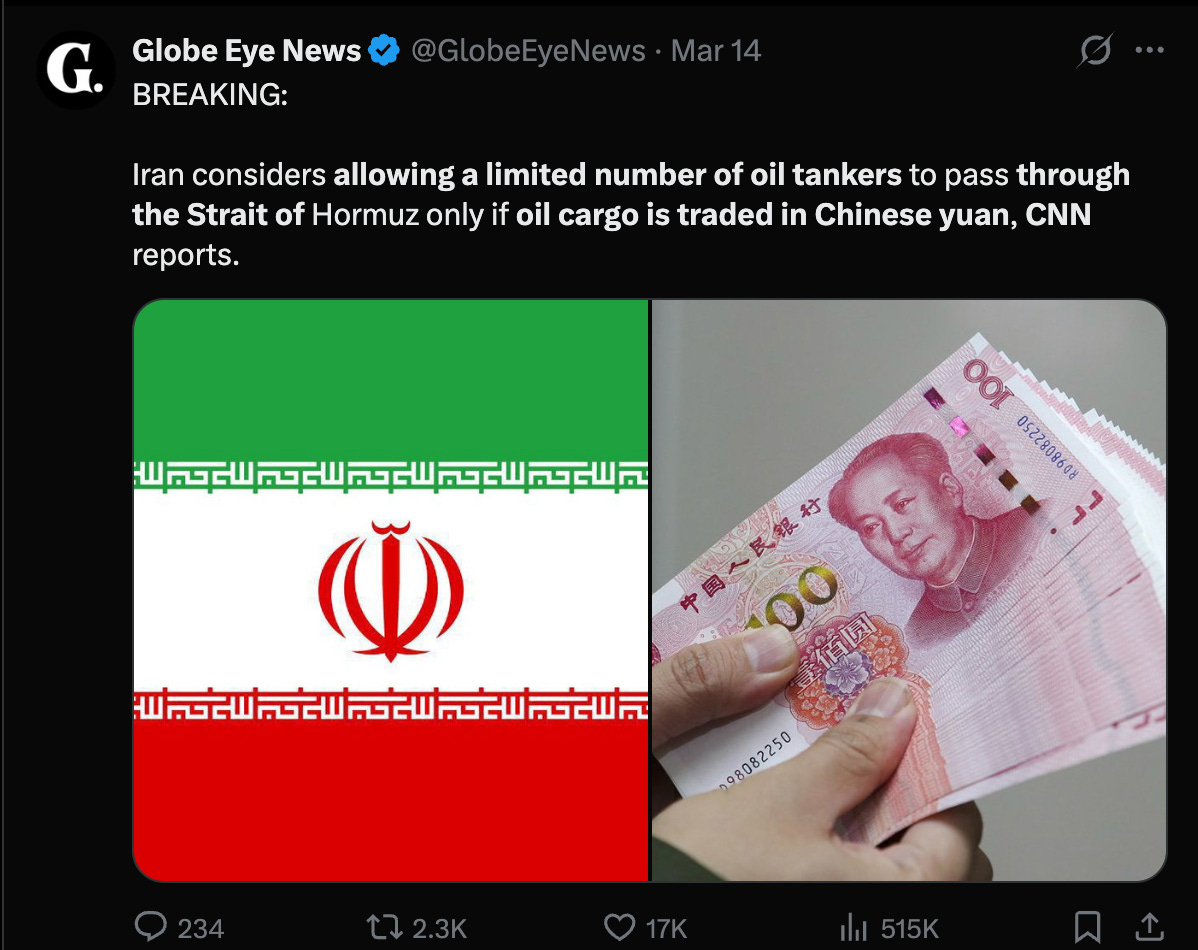 A lot of good info here. Fox News is not reporting that the Strait is open for those with Chinese money. I get the Zionist propaganda even though I do not seek it out.