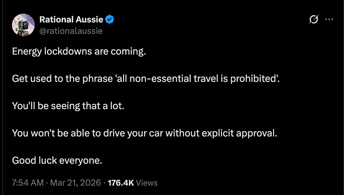 So how do you service debt you cannot explicitly inflate away? You engineer supply constriction. You let inflation arrive through energy prices. You make it look like someone else’s fault: a war, a strait, a regional conflict while bond yields climb and real wages quietly crater. The IEA’s ten-point demand-management report is, in one reading, a genuine crisis response from a multilateral institution doing its job. In another, it is the administrative documentation of a cost-transfer: the debt created by governments over two decades is being serviced, in real terms, by the households who can no longer afford to fill their cars.