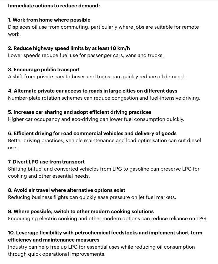 Work from home where possible. Lower highway speed limits by at least 10 kilometres per hour. Shift from private cars to public transport. Alternate private vehicle access in large cities by licence plate number. Increase car sharing. Improve freight driving efficiency. Divert LPG away from transport toward cooking. Avoid air travel where alternatives exist. Switch to electric cooking. Implement industrial feedstock flexibility and short-term efficiency measures.